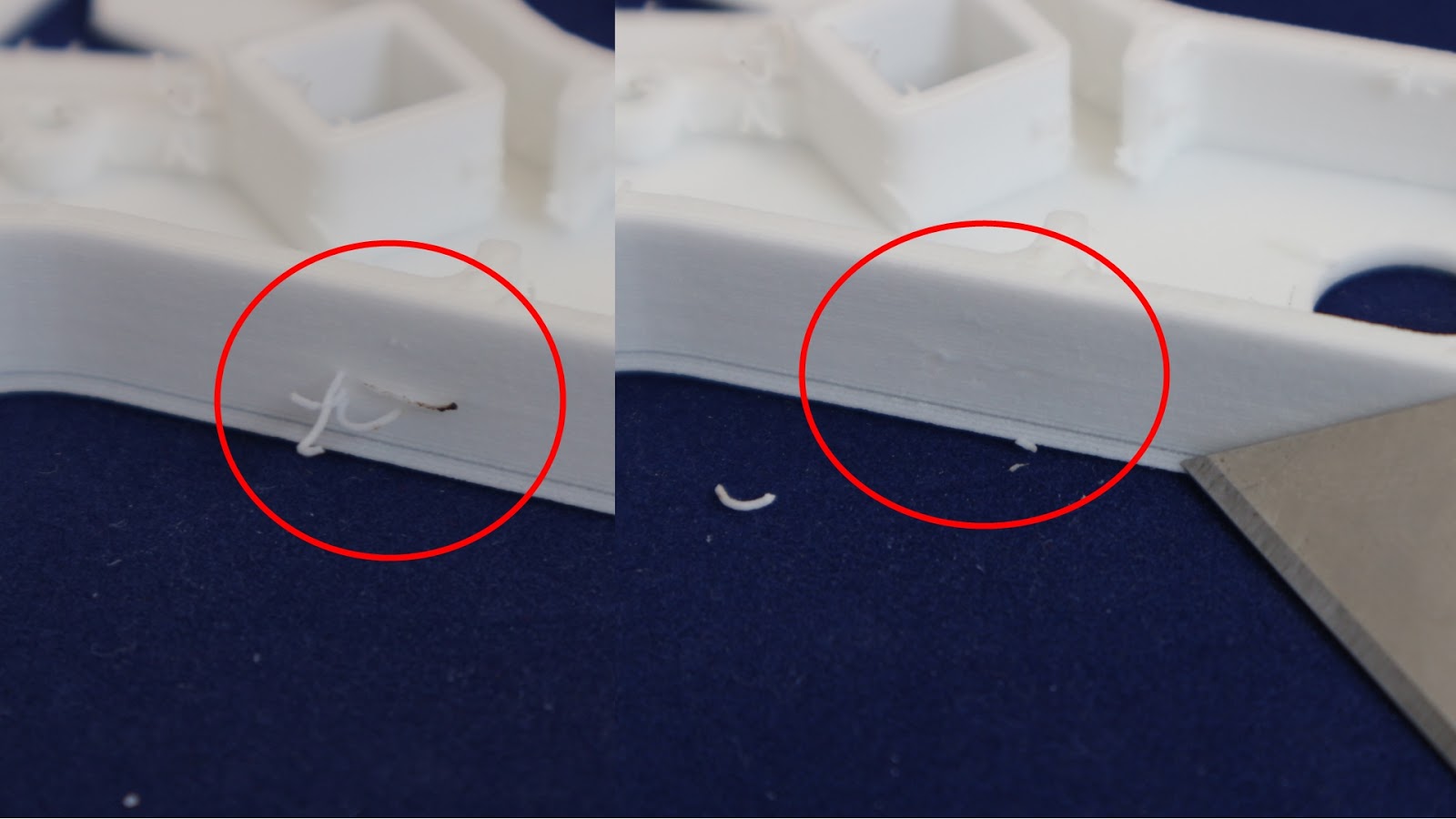 | Straight off the printer, you are going to see some hairs and stringing, these are easily removed. |