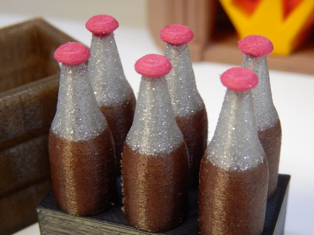 The six pack of bottles have a black PLA base, it's not seen and will help save on exotic filament. And cinnamon PLA for the body. At the top I'm using some Proto-Pasta Glitterflake to look like bubbles. Finally they have red caps in matte fiber HTPLA.